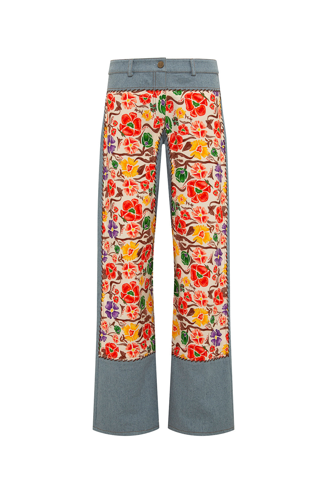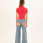 - Wide-leg jeans with patchwork detail