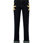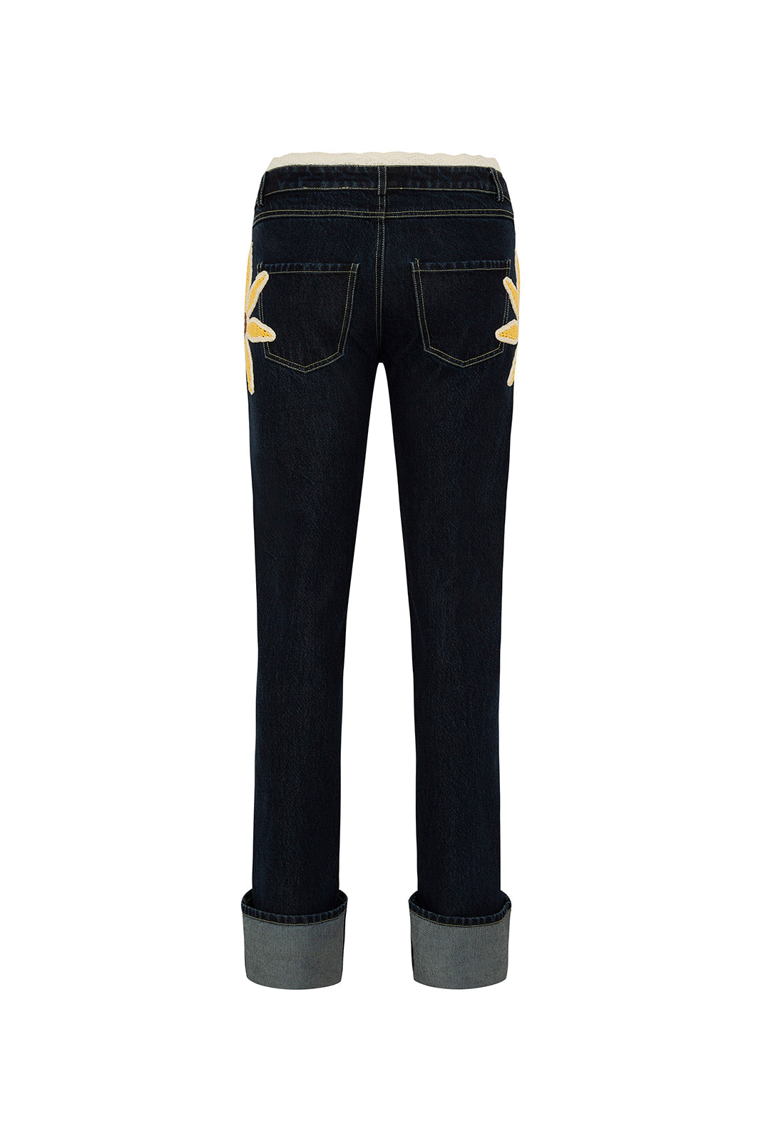 Denim pants with crochet sunflower