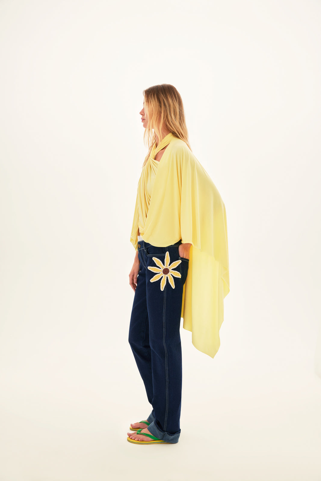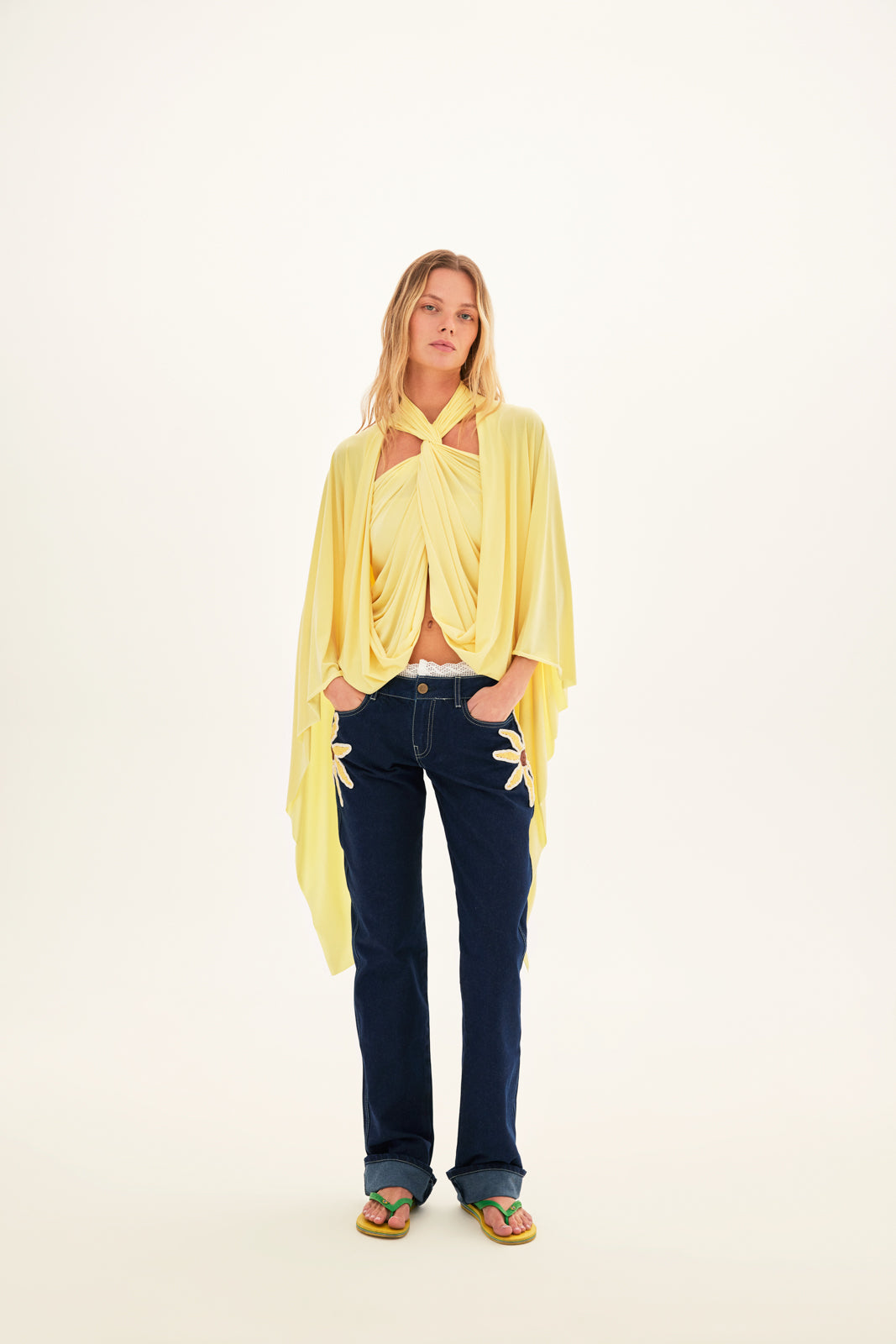- Wide-leg jeans with crochet flower detail